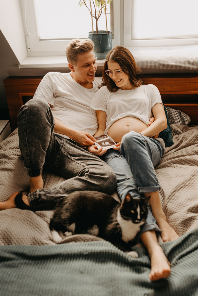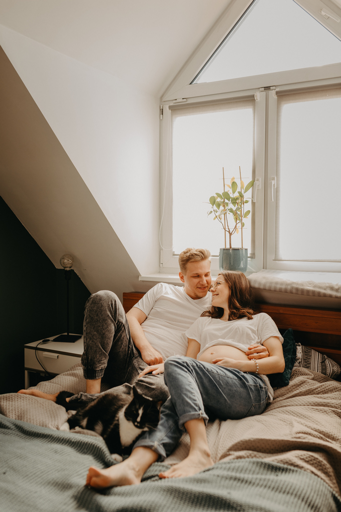 Zwierzęta na sesji ciażowej w domu nie są problemem. Koty to świetni towarzysze podczas naturalnych, domowych sesji ciażowych.